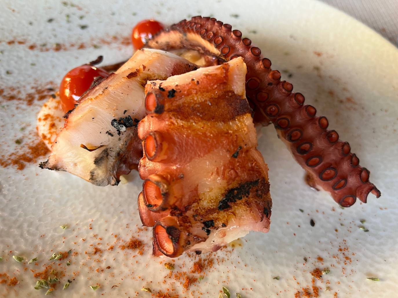 La Loca María puede presumir de un entorno envolvente que te aísla del exterior y permite centrarte en la comida y la bebida. Un entorno verde y con un toque laberíntico que dota al espacio de una singular y acogedora intimidad. Primera alegría culinaria: el uso de las tortas Inés Rosales como base para un sabroso taco andalusí con aguacate y queso. Una de esas ideas que apuntas para replicar en casa. Seguimos con una burrata de búfala con tomate de temporada, pesto de avellana y queso de Las RRR de Maracena –que ha vuelto a ganar un premio en los World Cheese Awards– y con una contundente pata de pulpo a la parrilla, ahumado al tomillo con parmentier al romescu. Ya saben que amo a los cefalópodos. Y esta pata gruesa y carnosa me pareció sobresaliente. Rematamos con el entrecot de vaca vieja prémium y, para el postre, una de las joyas de la casa: la torrija de brioche con helado de leche merengada. Comida desenfadada, idónea para compartir, y muy sabrosa. Buen producto muy bien tratado con precio razonable.