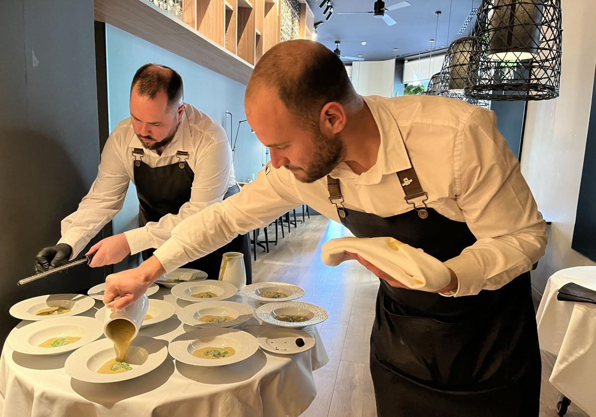 La tentación era dejar de hablar con el resto de la humanidad, hacerte el longui, como si estuvieras centrado en el móvil, para dedicarte a perseguir las bandejas que volaban a tu alrededor con propuestas como el steak tartar de vaca madurada al estilo Atelier, por ejemplo, de los que apenas si me comí tres. O el de corvina con codium, lima e infusión de coco, albahaca, jengibre y galanga.