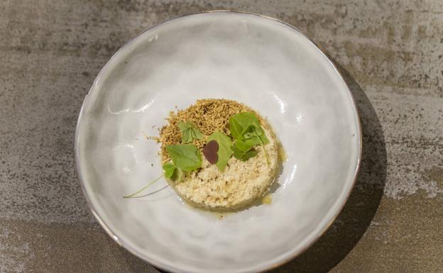 ¿Un risotto sin arroz? Sí, porque el risotto es una técnica a través de la que «risolamos con un elemento graso», señala Urda, que comenzó por convertir el apionabo el granos parecidos a los de arroz: se corta finamente en tiras y de ahí se sigue cortando hasta dejarlo casi desmenuzado. Se le añade una mantequilla noisette, con sabor a avellanas y frutos secos para potenciar el sabor de su propuesta.