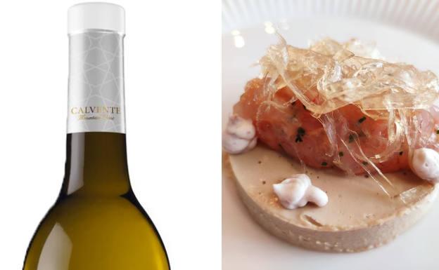 Esta primera propuesta de maridaje sirve para abrir boca con un Calvente blanco seco en perfecta armonía con los sabores marinos del Mediterráneo, con las quisquillas y las algas aportándole profundidad y textura al foie.