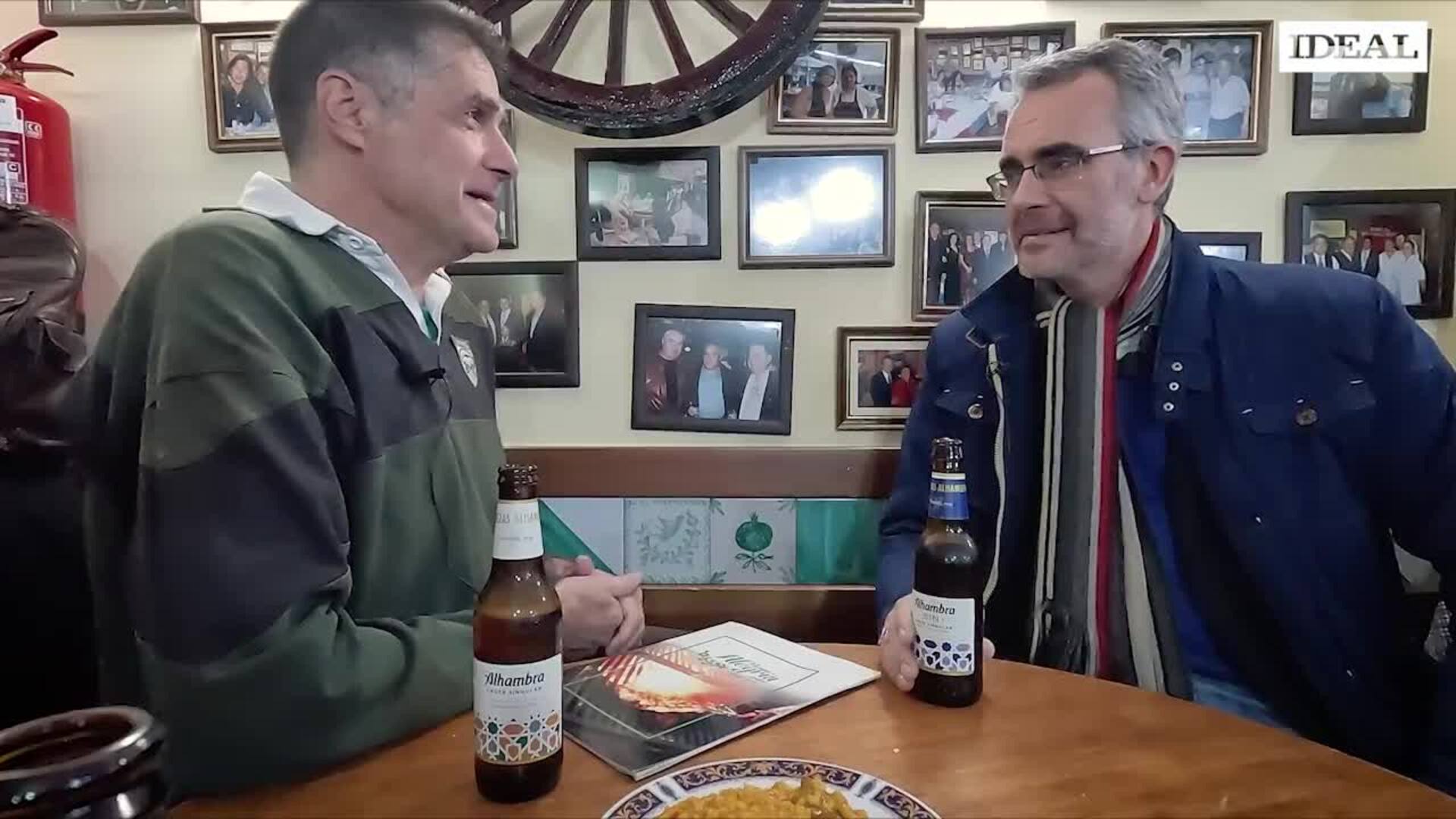 Jesús Lens habla de música y literatura con Cid mientras comparten una cerveza en el Mesón Alegría