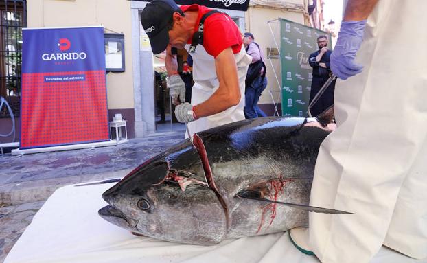 El restaurante Alacena de las Monjas trae a la Plaza Padre Suárez el espectáculo del despiece del codiciado túnido gaditano