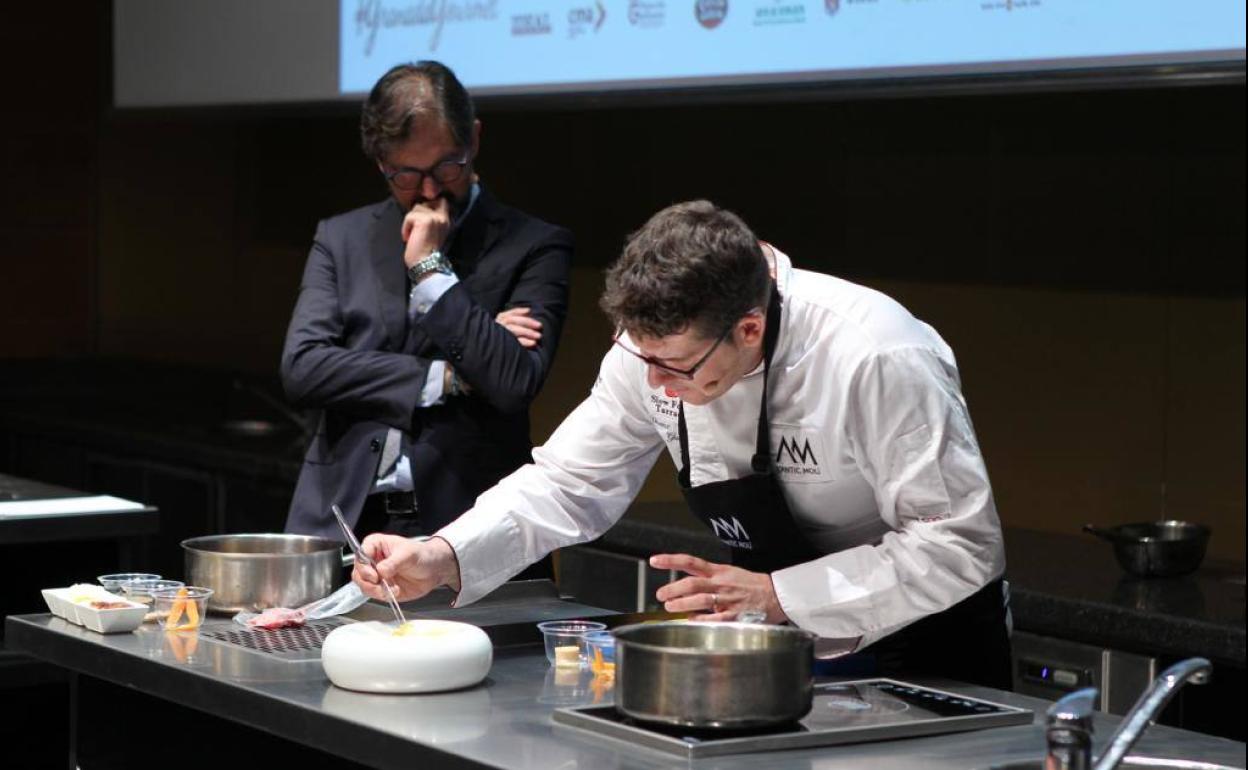 Algunos de los platos que servirá esta noche los ha presentado en su ponencia. Ha elaborado cuatro en vivo: con cordero, caviar de esturión de Teruel, raices de puerro, anguila o pato, que han inundado tras pasar por su manos de buen olor el auditorio.