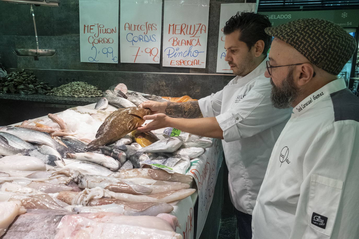 Frente a nosotros, vestido con una llamativa camiseta roja, el responsable de la pescadería Ángeles despacha dos bolsas de producto a una clienta habitual, ataviada con un veraniego vestido, largo y fresco. En chanclas y bermudas, esperando su turno, una pareja de turistas extranjeros que han decidido comer en el apartamento turístico donde residen estos días en Granada. Se llevan unos lenguados frescos, frescos. Frente a mí, en fin, otro viajero aprovecha para dejarse limpiar los zapatos a la antigua usanza, algo que ya no se estila, mientras un vendedor de lotería asegura que lleva el Gordo de Navidad.