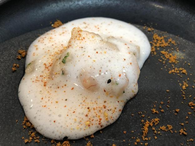 Antonio recuerda aquellos años en el barco, trabajando de sol a sol... y más aún. Largas jornadas entre redes, salitre, viento y aparejos. Y reivindica la esforzada labor de esos pescadores que, cada día, dan lo mejor de sí mismos para llevar el producto más fresco a la lonja. Por ejemplo, las quisquillas llamadas 'del último tirón', las que se cogen justo cuando el barco empieza a volver y que llegan todavía coleando al puerto de Motril. El siguiente plato protagonizado por nuestra estrella de hoy es una gyoza de quisquilla rellena de codilllo sobre base de coco y almendras. En este caso, se trata de un mar y montaña que refuerza y potencia los sabores de cada uno de sus ingredientes.