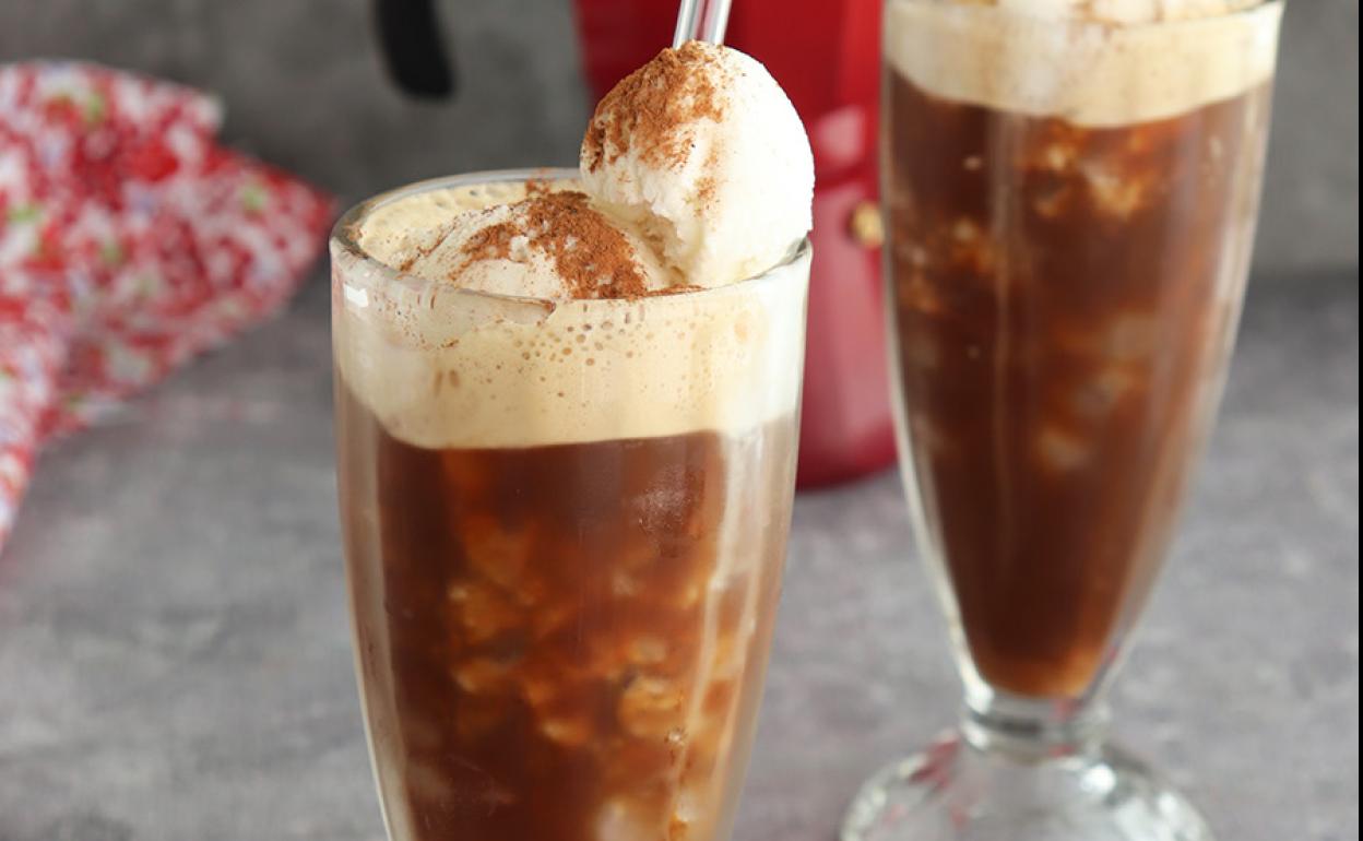 Preparamos el café, que puede ser descafeinado, y dejamos que enfríe. Trituramos con el hielo, servimos en las copas y ponemos una o dos bolas de helado. Espolvoreamos con canela molida y ya sólo queda disfrutar.