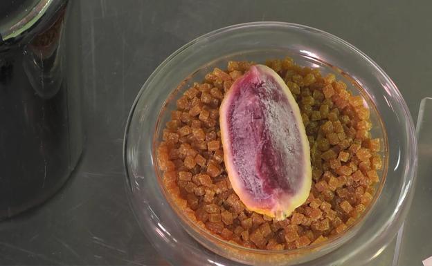 «El año pasado Ángel León presentó un queso de hueva de leche en el que yo colaboré para su formulación. Eso me dio algunas ideas para conseguir un producto nuevo», explicó el experto en fermentaciones. Una forma de unir lo mejor de la gastronomía francesa a través de una royal normal con foia preparado con leche y gelificante. Con sus dos recetas listas, Txema quiso ir un paso más lejos y preparó un helado de vermú que sirvió junto a papel de manzana, unas tostas de pan y la royal de foia y penicillium camemberti.