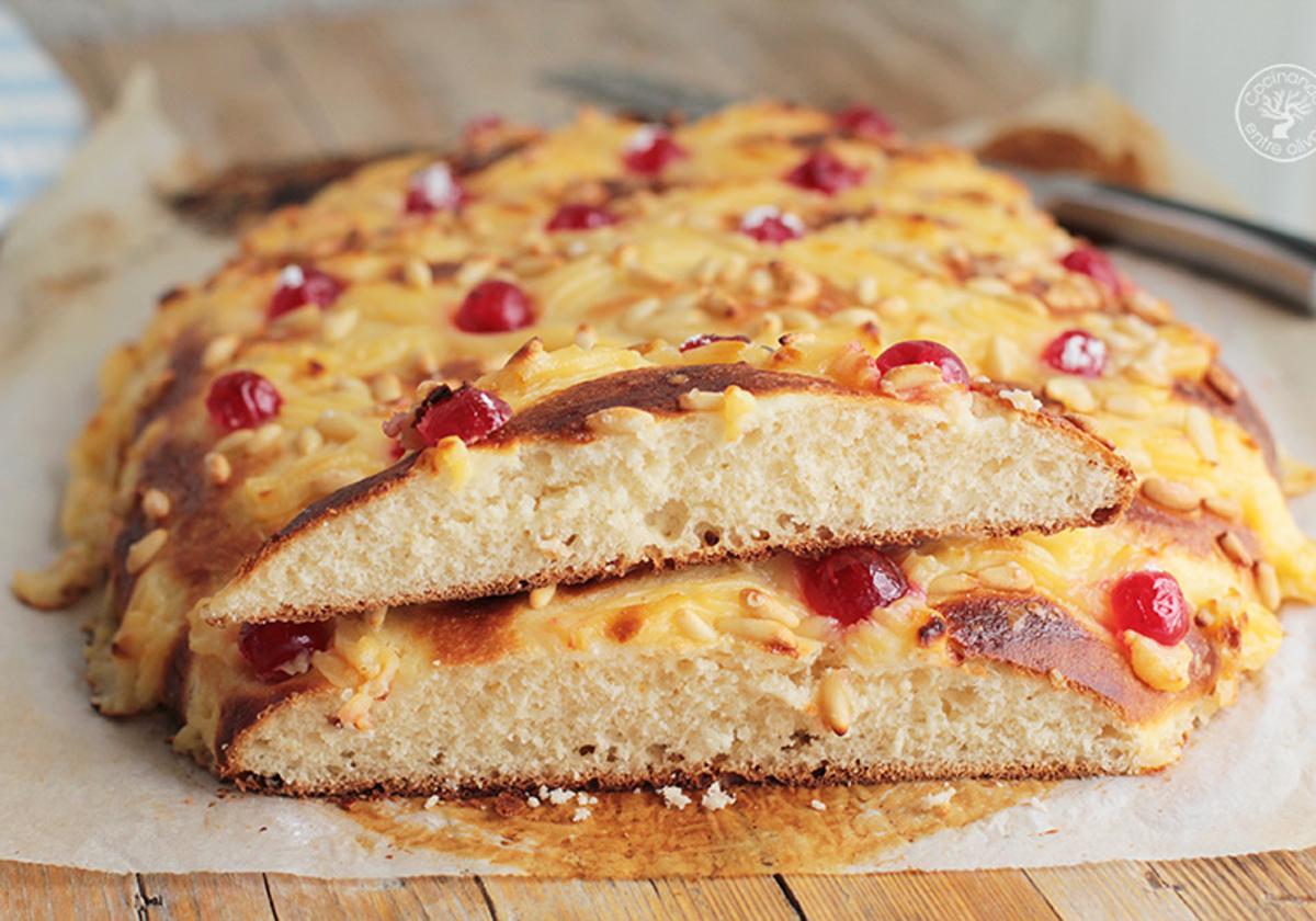 500 gr de harina de fuerza o gran fuerza, 10 gr de sal, 100 gr de azúcar, 150 gr de huevo (3), 100 ml ... de agua fría, 100 gr de mantequilla, 40 gr de levadura fresca más 20 ml de agua, huevo batido con sal para pincelar, crema pastelera, guindas, piñones y azúcar glass.