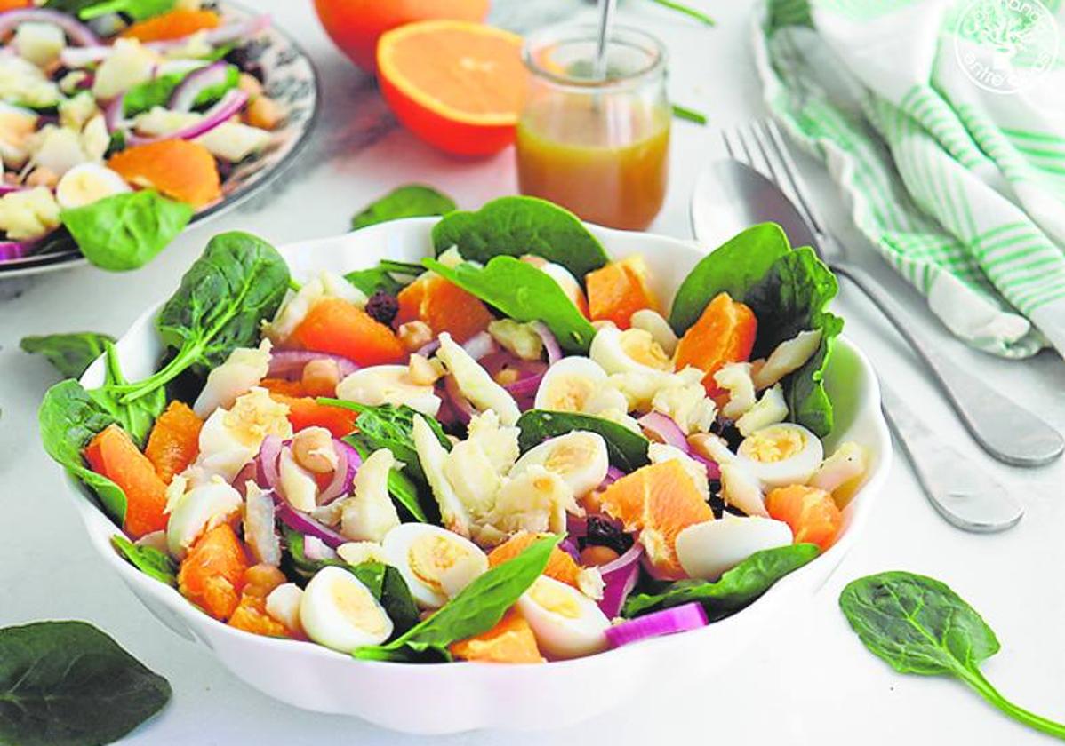 Os propongo preparar una completa, riquísima y súper rápida de hacer ensalada de espinacas con garbanzos y bacalao, aliñada con una vinagreta de naranja, miel, ... mostaza y AOVE que la hace irresistible. Podéis hacerla con antelación, por lo que es una comida apta para táper. Eso sí, no la aliñéis hasta el momento de consumir.