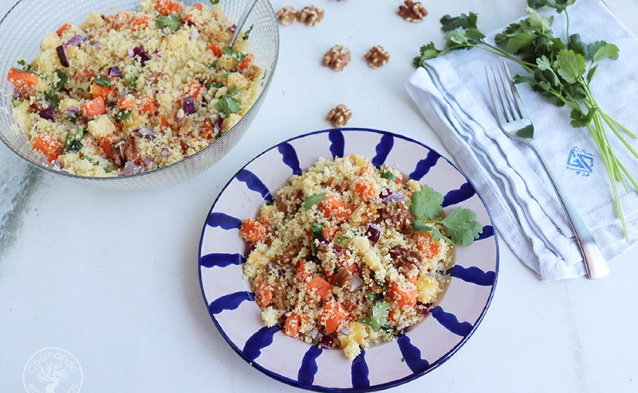 Dejamos reposar unos diez minutos y lo ponemos en una fuente. Con una cuchara o tenedor lo mezclamos para que se suelte bien. Añadimos la cebolla picada finamente, las batatas cocidas –las he preparado en el microondas, que pelamos y cortamos en dados, como el queso– unas hojas de cilantro y unas nueces.