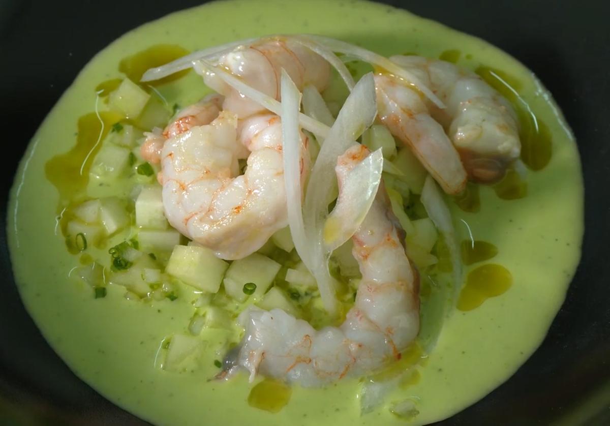 «Voy a hacer algo muy sencillo, una ensalada de pepino templada en la que se aprovecha todo el pepino», comentó antes de empezar. Primero preparó una crema con el corazón del pepino, aceite, sal y agua. Mientras que también cortó un poco de pepino en dados a los que agregó un poco de cebolleta y cebollino picado. Con estas dos elaboraciones listas, peló cuatro gambas blancas y utilizó sus cabezas para freírlas en la sartén. Así como las propias gambas ya limpias.