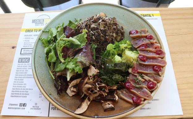 Aliñamos la lechuga con una vinagreta a base de aceite de oliva y vinagre. Blanqueamos el brócoli. Mientras, laminamos el champiñón en crudo. Para el gel de remolacha empleamos remolachas frescas con aove, sal y pimienta y las pasamos por la Thermomix durante 3 minutos para conseguir la textura deseada. Aparte marcamos el tataki de atún previamente marinado en soja y cítricos. Desgranamos la granada y a disfrutar. ¿Quién dijo que comer sano era aburrido?