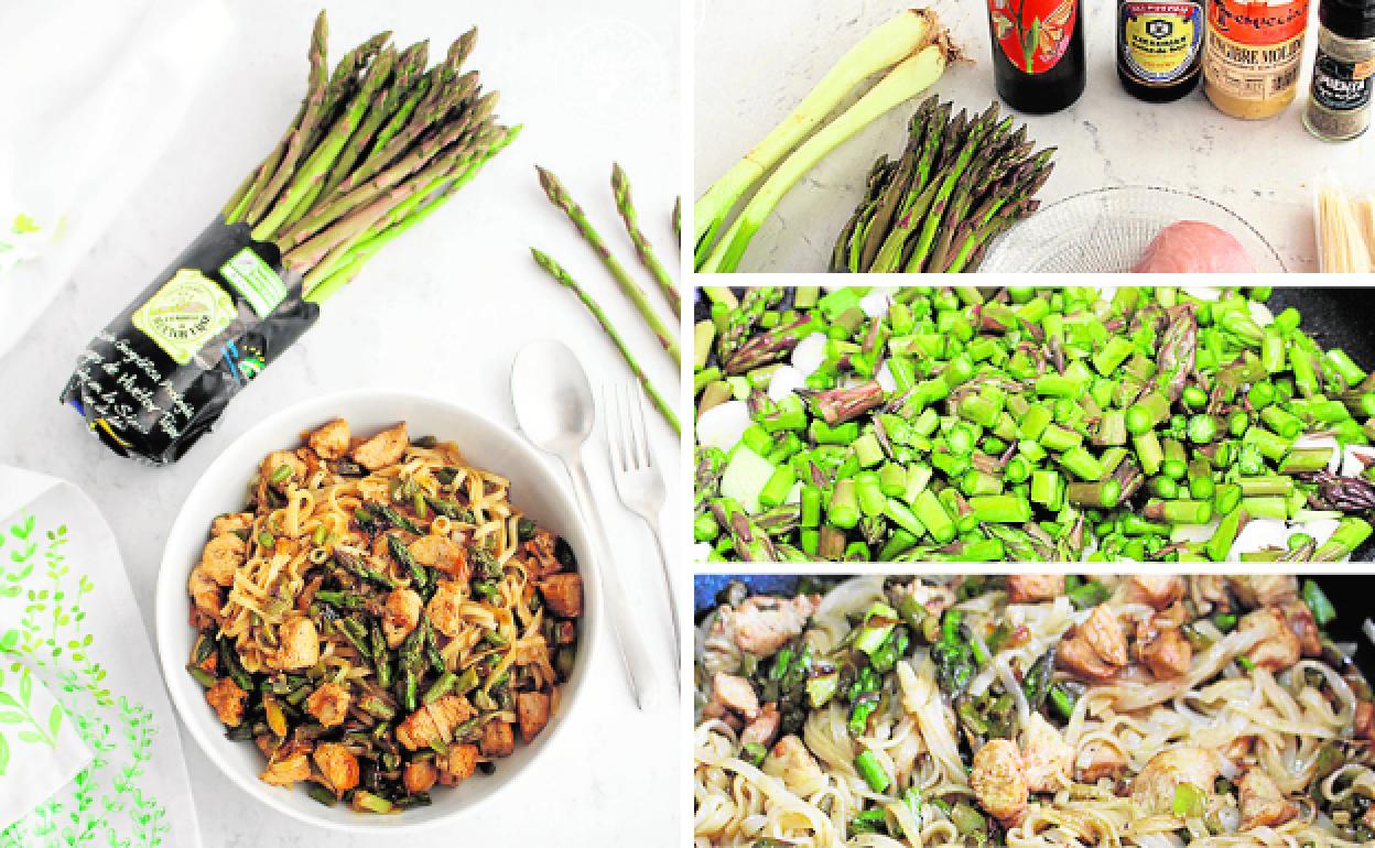 Los espárragos certificados llevan una contraetiqueta numerada expedida por el consejo regulador que garantiza el origen y la calidad del producto. Les cortamos la parte dura del tallo y enjuagamos con agua bajo el frío. Troceamos y ponemos los espárragos y las cebolletas en una cazuela, o wok, con un poco de aceite de oliva virgen extra. Salteamos unos minutos, añadimos la pechuga de pollo cortada en dados, mezclamos y cocinamos. Mientras hacemos los fideos siguiendo las instrucciones del fabricante, en esta ocasión, se cocinan durante 4 minutos en agua hirviendo, se escurren y se deben pasar por agua fría. Los escurrimos y añadimos a la cazuela. Incorporamos salsa de soja, pimienta, jengibre y salsa de pad thai. Mezclamos y cocinamos un par de minutos más. Servimos y a disfrutar. Este plato es perfecto para toda la familia.