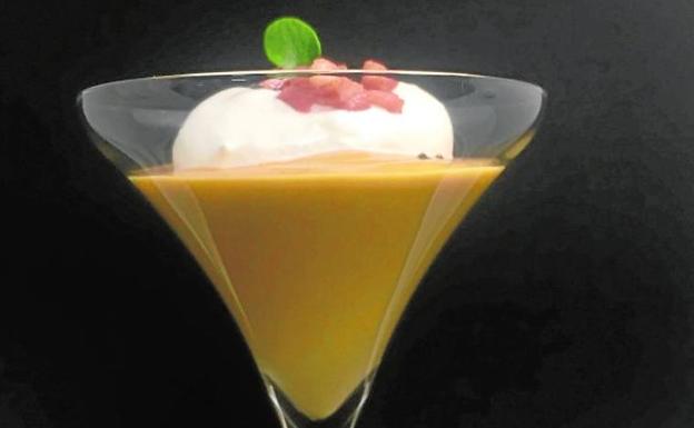 Para el montaje, disponer la crema en el fondo de una copa y añadir espuma de panceta ahumada, acompañar también un poco de panceta ahumada salteada. Es una preparación ideal para empezar una comida.