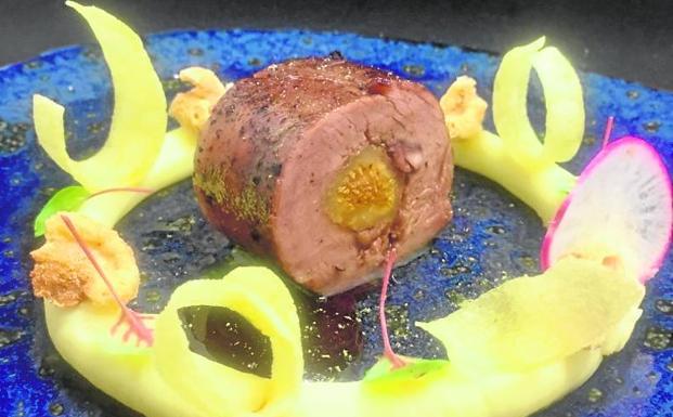 Solomillo relleno de frutos secos, jugo de vinagre y vino