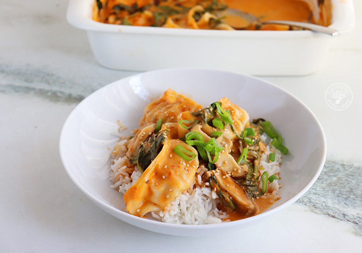 Comenzamos preparando la base de la salsa directamente en una bandeja apta para el horno. Mezclamos bien con unas varillas la pasta de curry rojo, el jengibre rallado, la salsa de soja, el azúcar, el aceite de sésamo, la salsa chilli garlic y la leche de coco, aprovechando el agua para recoger los restos de la lata. Podéis ajustar la cantidad exacta de estos ingredientes según os guste más o menos picante. Una vez tengamos una mezcla homogénea, disponemos las gyozas de pollo (directamente congeladas) y las setas laminadas por toda la bandeja. Tapamos con papel de aluminio y horneamos a 180°C durante 15'. Pasados, retiramos el papel, añadimos las espinacas frescas, mezclamos con cuidado y horneamos unos 5/8 minutos más sin tapar. Servimos este espectáculo de sabores sobre una base de arroz basmati y decoramos con semillas de sésamo y la parte verde de la cebolleta picada.
