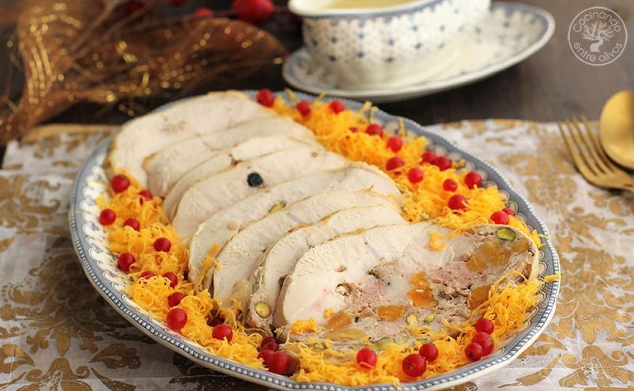 Esta es mi receta para la comida de Navidad. Sirvo el pollo frío, acompañado de una salsa caliente, para prepararlo con antelación. Podéis rellenarlo con ... muchos ingredientes, a vuestro gusto. Yo lo hago con carne picada, de cerdo y pollo, orejones, pistachos y un sofrito de cebolla y ajo que lo hace muy jugoso. Lo más complicado es preparar el pollo: hay que deshuesarlo y dejarlo entero. Seguro que en vuestra carnicería de confianza os lo preparan como hace Manolo, del Covirán de Churriana de la Vega, un artista.