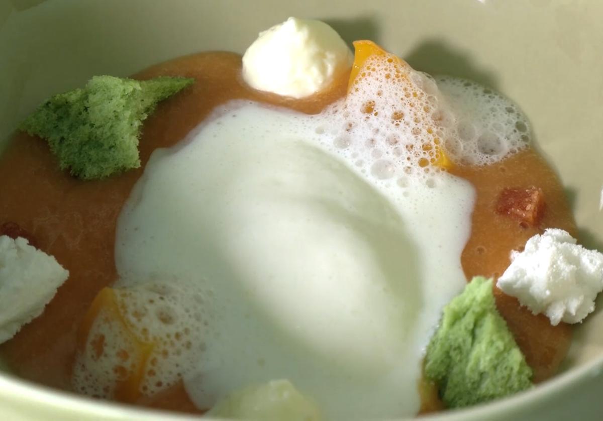 El plato en cuestión contaba con una sopa de maracuyá y guayaba como base, a la que la cocinera agregó unos trozos de melocotón asado. También añadió un bizcocho de hierbabuena hecho en sifón para dar al postre textura. Y sobre todo ello puso un dulce de maracuyá, una crema de mascarpone y nata, un trozo de merengue y un aire de kéfir.