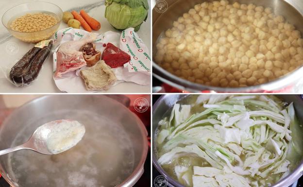 300 gr de garbanzos, 1 muslo y sobremuslo de pollo, costilla salada, morcillo de ternera, hueso de jamón, hueso blanco, tocino, media col, 2 o 3 zanahorias, 2 patatas y morcilla.