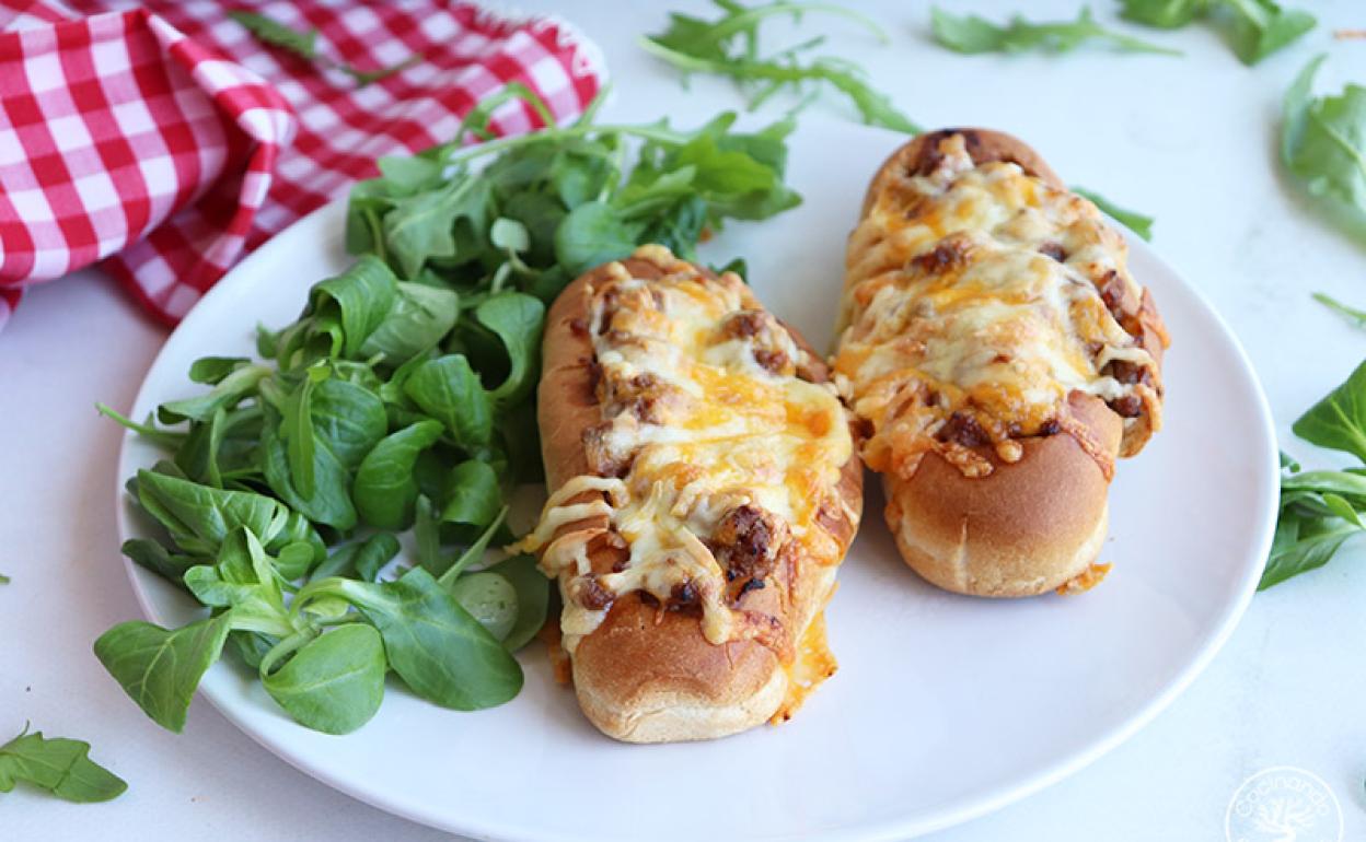 En este hueco ponemos la carne, cubrimos con abundante queso rallado y metemos en el horno, precalentado, a 180º C, unos 12 minutos o hasta que veáis que el pan está dorado y el queso fundido.