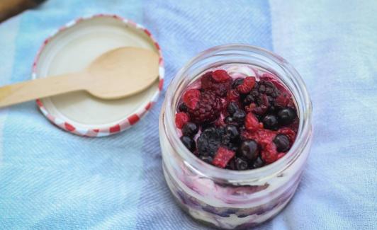 Elaboración: Trituramos las galletas, mezclamos los dos quesos junto con el azúcar. En un tarro ponemos una base de galletas. Encima, crema de quesos, luego frutos rojos y repetimos las capas, galletas, mezcla de queso y terminamos con frutos rojos. Cerramos con la tapa y guardamos en el frigorífico.