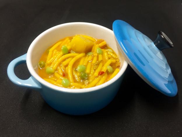Por otro lado, picar muy finamente la verdura, con un poco de aceite sofreír la verdura con la patata cortadas a pequeños cascos, añadir el tomate pelado y picado finamente, dejar cocer un poco y añadir el caldo de la pescadilla, añadir colorante y empezar cocer lentamente, desgrasar. Una vez bien cocinado nuestro caldo, añadir los fideos y dejar cocer. Por último añadir las habitas.