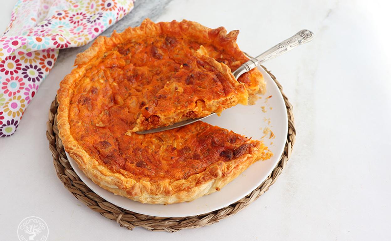 Esta semana os propongo preparar una rica tarta salada. Podéis hacerla con hojaldre o con masa quebrada. Es similar a la quiché francesa, pero con ... un relleno muy nuestro: unos orejones (albaricoques deshidratados) y sobrasada; una mezcla de sabores que combina muy bien.