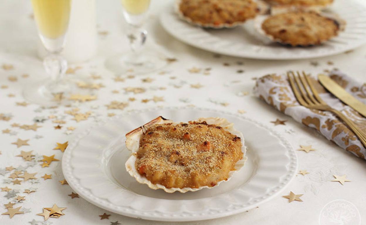 Vieiras gratinadas con gambas al cava