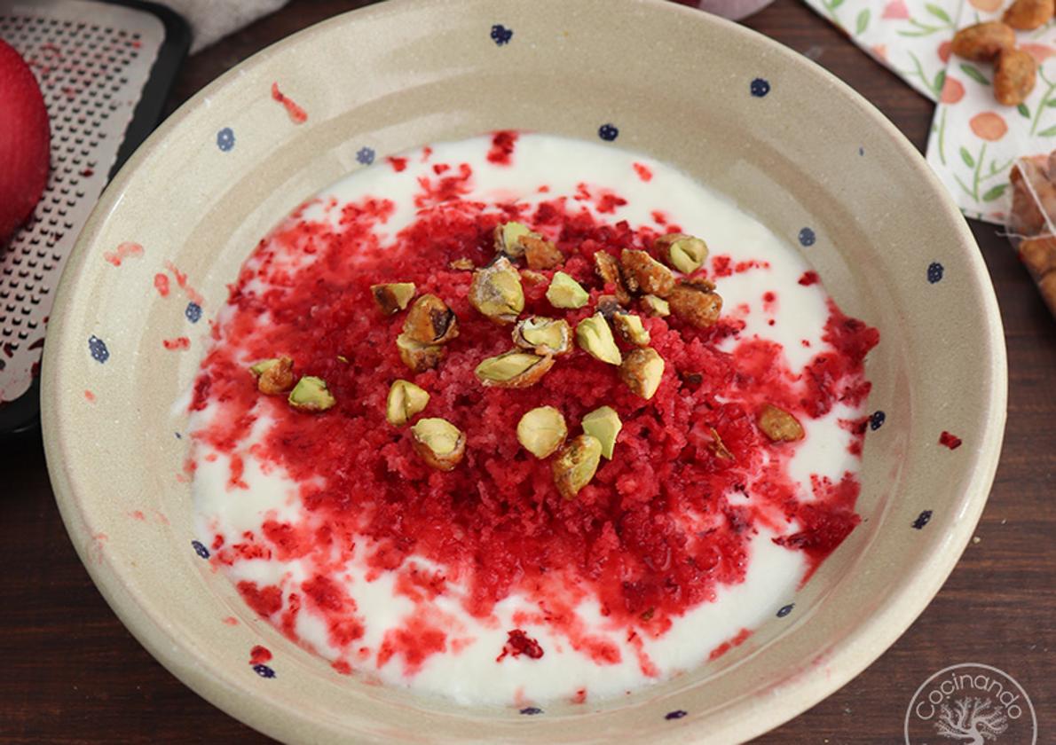Cuando vayamos a prepararlo, disponemos el yogur en un cuenco, rallamos una ciruela, que nos quedará con una textura similar a la de un sorbete, perfecta para el contraste con el yogur.
