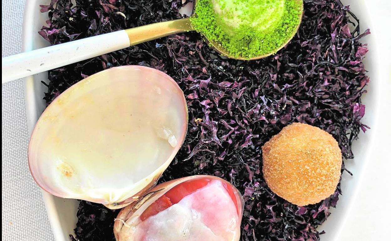Málaga también nos ofrece el sabor de la mar, incluyendo el potente aroma de las algas y las escolleras contra las que rompen las olas. La concha fina, más fina que nunca, con velo de tocino ibérico y tomate de mar, gel de manzana con tuétano vegetal y croqueta de alga.